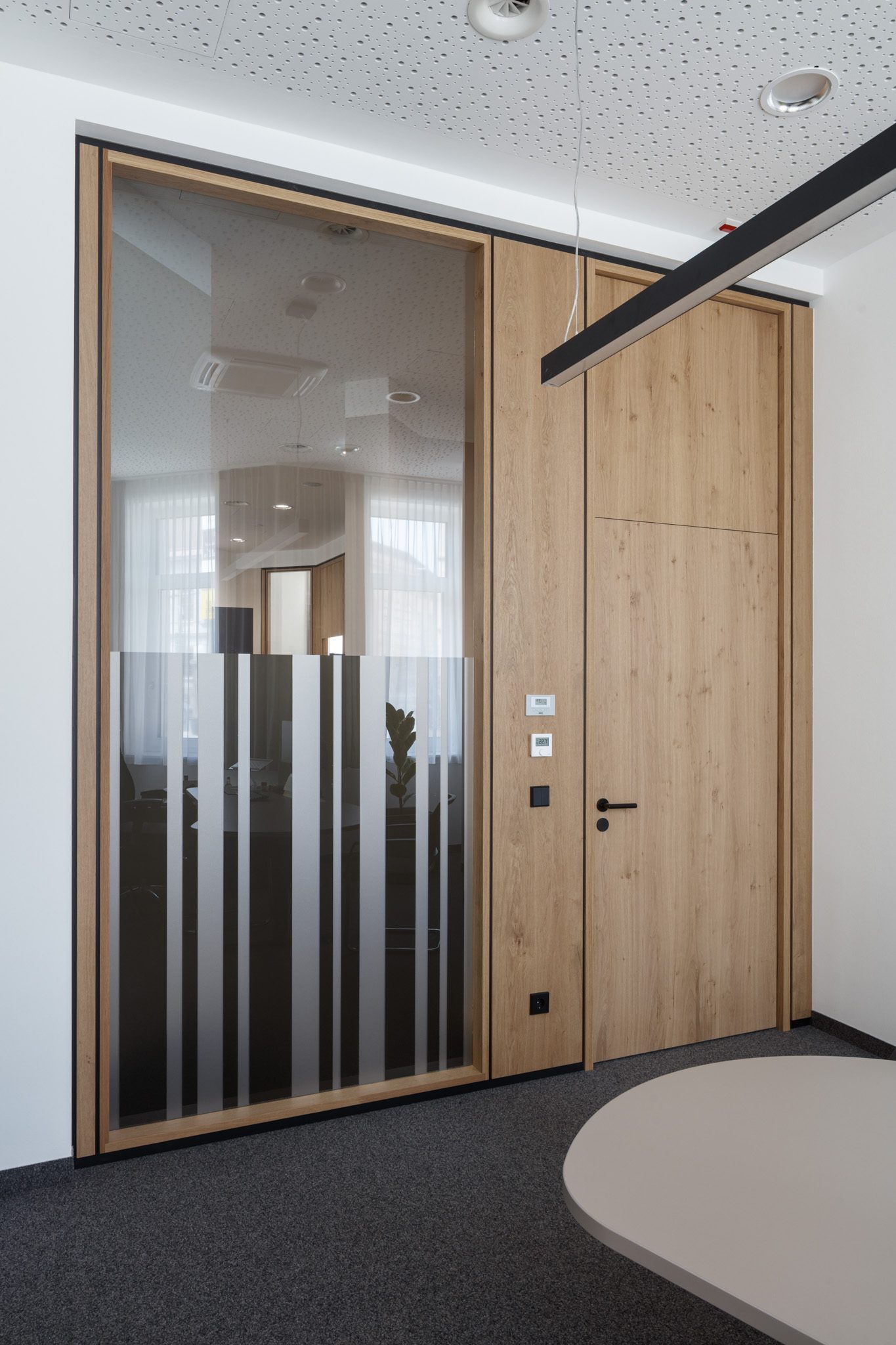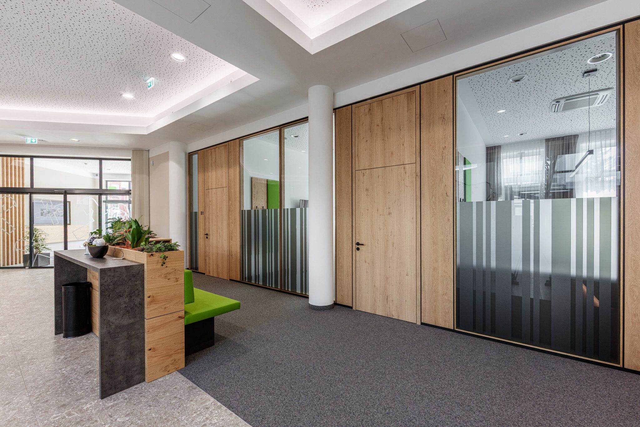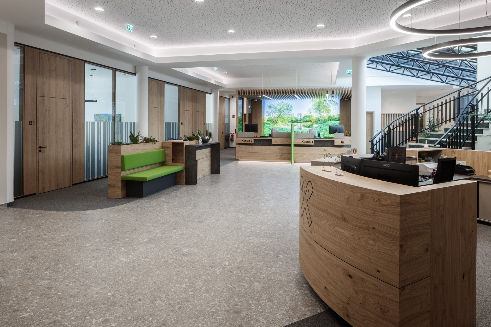 „Im Auftrag von der Tischlerei Manigatterer wurden im Zuge der Modernisierung des Kompetenzzentrums der Raiffeisenbank Waidhofen a. d. Thaya die Kassen und Beratungsbereiche mit Systemtrennwänden von Scheicher.Wand ausgestattet. Die Ausführungen in Asteiche mit getönten Glas sorgt für klare Raumstruktur sowie eine ausgewogene Verbindung aus Offenheit und Diskretion. Die Kombination aus natürlichen Materialien und Transparenz prägt eine moderne, ruhige Raumwirkung.“ – Florian Salfelner